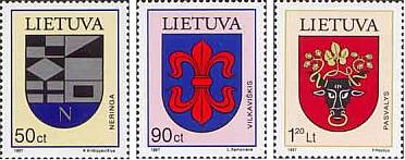 | LIT- 165-67 | Pic | COA of Towns '96 (Seduva,Panev,). 3v: 50, 90, 1.20 | 19.10.96 | 621-23 | 554-56 | ||
